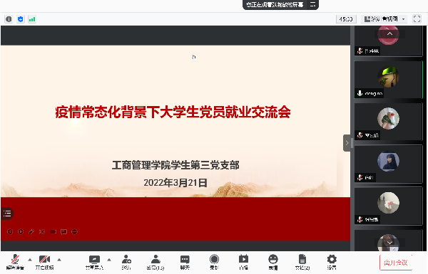 3月21日下午,学院第三党支部在线上举行了“疫情常态化背景下大学生党员就业交流会”,学院副书记、副院长邓娜,第三党支部书记张艳敏,辅导员娄明珠、周懿韵和全体第三党支部学生党员参加学习。
