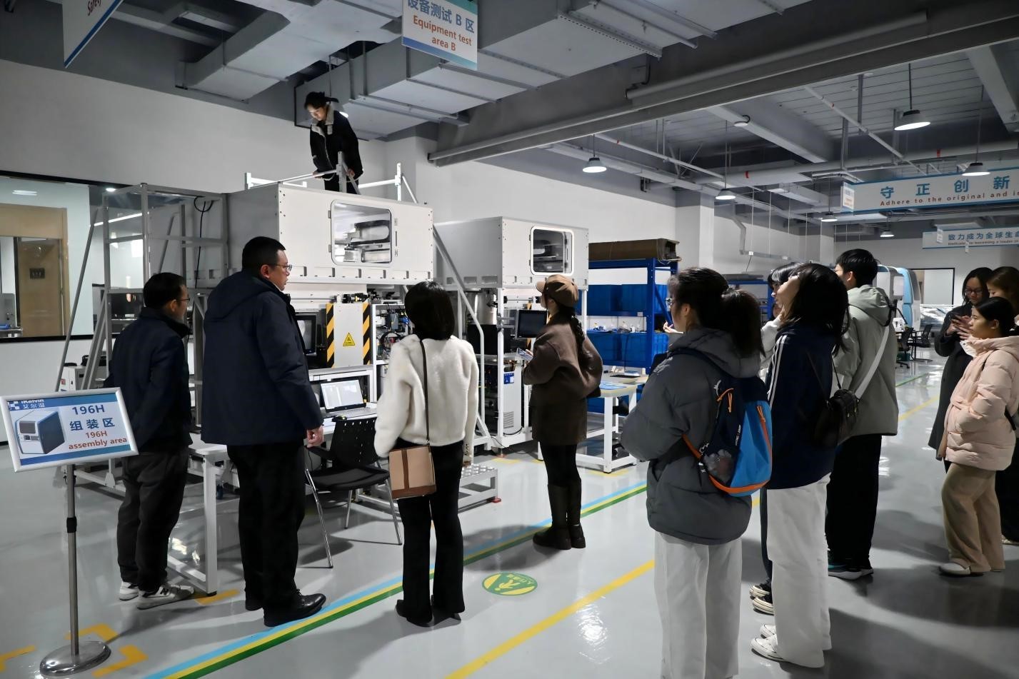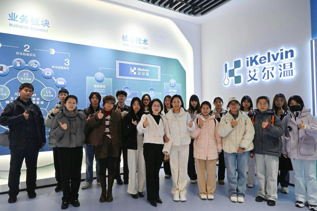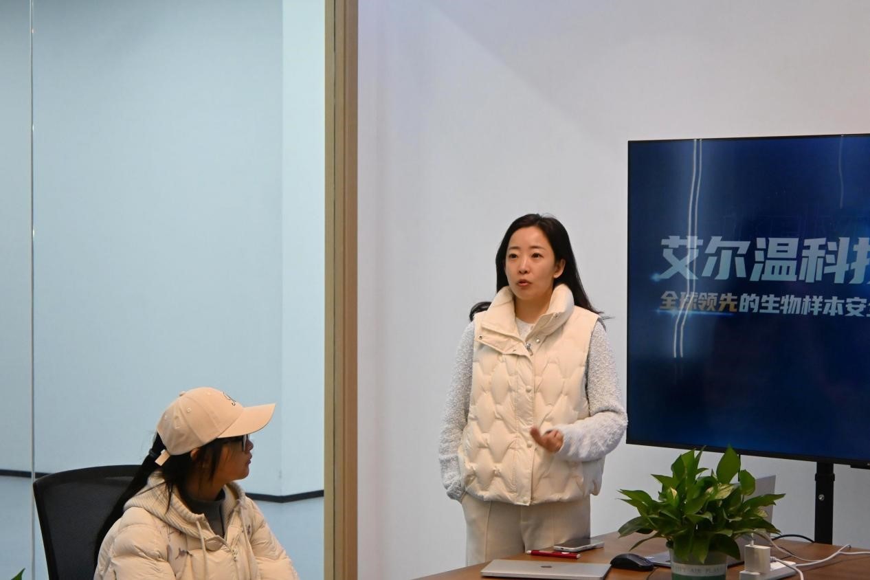在艾尔温创始人兼董事长韩雨卿博士的陪同下,师生深入企业展厅与生产车间,实地考察深低温技术在生命科学领域的创新应用。生产总监在-196℃生物样本智能存储系统组装区作专业讲解,引导学生登梯观察产品内部结构与运作机制,并结合医院生物样本库案例,详细介绍定制化解决方案,有效增进了学生对深低温技术科研应用的直观认知。