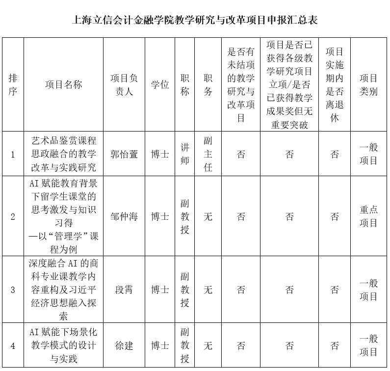 依据《上海立信会计金融学院教学研究与改革项目管理办法》及教务处发布的《关于开展2026年校级教学研究与改革项目申报工作的通知》规定,经学院教师自主申报,院教学分委员会审核排序,院党政联席会议审议,现将学院推荐结果予以公示:
