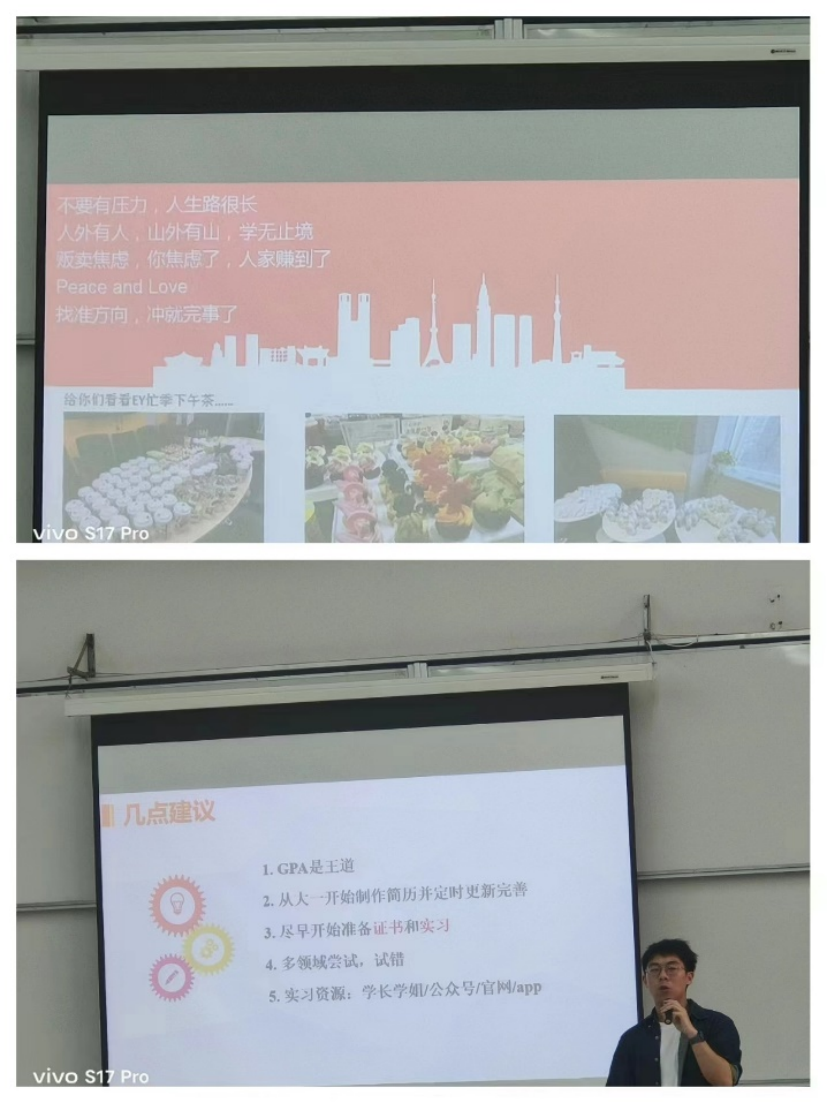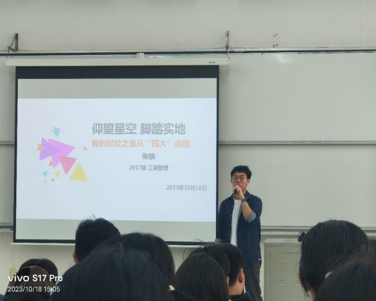 活动中宋轶学长坦诚的和新生们谈到大学生活要怎样过,应该怎样过,以及对未来四年的大学生活想怎样过的问题,他分享了自己大学四年的奋斗史,逐渐把自己从懵懵懂懂的少年磨练成了职场精英,不管是立信的优秀毕业生,是“四大”的审计师,还是企业财务的小主管,不论何种身份,都离不开勤奋和努力这两个词。对于大一新生未来的规划,宋轶表示要多学技能,早做实习的打算,记得考证,还要多尝试错误,才能不断成长。察觉到新生们还没有完全适应大学生活,焦虑是通病,作为学长他鼓励到:人生路很长,人外有人,山外有山,学无止境,要学会贩卖焦虑,朝着一个方向努力前进!