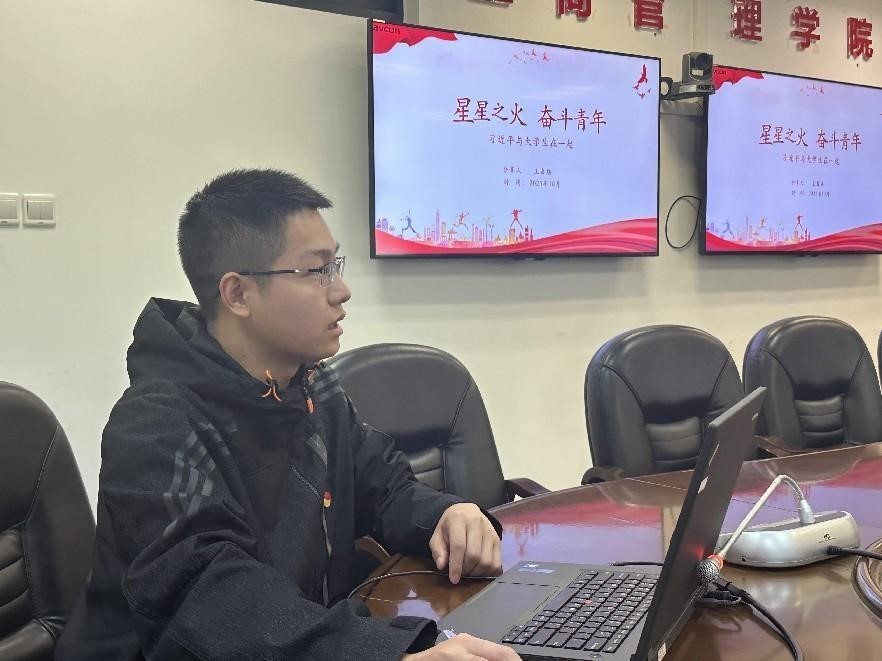 朗诵比赛结束后,在场师生在会长王嘉琪同学的带领下开展了“习近平与大学生在一起”专题理论学习。会长播放了《温暖——习近平与大学生朋友们》视频,再结合部分习近平总书记走访高校的图片和讲话,向在场师生展现了习近平总书记近年来对大学生始终如一的关注、关心、关爱。随后,会长援引习近平总书记2023新年贺词和西安交通大学王树国校长开学第一课讲话内容,并向部员们推荐了与专业相关的书籍,强调大学生在学习上要注重理论与实践的结合,牢记殷殷嘱托,把青春奋斗融入党和人民事业。