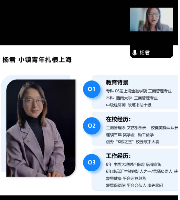 杨君,现任复星集团保德信合伙人,在保险、食品、电商等多个行业有丰富的从业、创业经历,曾在中国大地财产保险从事品牌宣传,随后创立上海康品汇生鲜食品有限公司,并获知名风投机构高榕资本1.7亿元的投资,担任过宏济堂电商总经理。她首先结合大学新生普遍存在的“大学生活很无聊”这一现实心态,指出大学生应围绕“首孝悌、次谨言、泛爱众、而亲仁”几个方面加强自身“内核”修炼,才能更好的面对全球经济下行时期严峻的就业现状,并把握未来经济复苏带来的机遇和考验。随后,她就大学生如何警惕高消费、控制金融风险、做好信用管理等方面给出具体的建议。