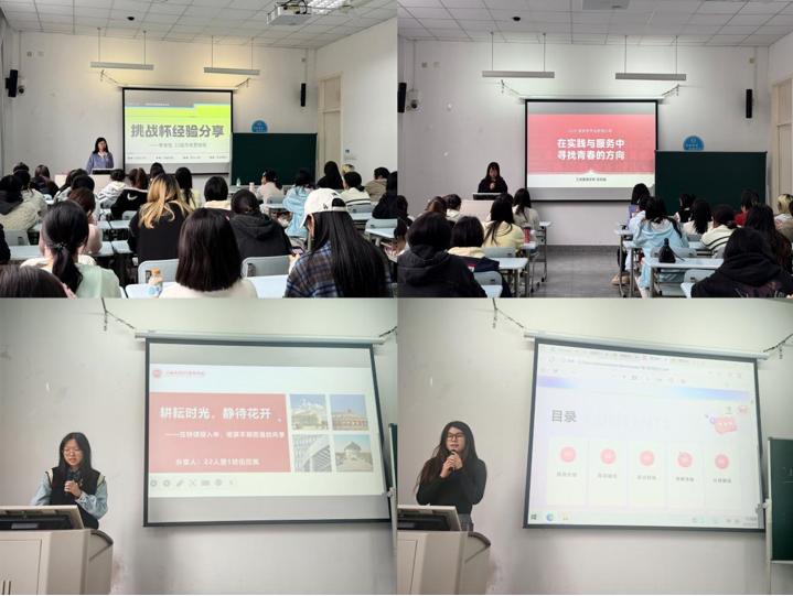 首位分享者李佳怡同学以“挑战自我,杯载荣光”为题,详细分享了其参与“挑战杯”竞赛的心路历程。她从参赛初心谈起,系统地阐述了备赛过程中的关键要点:在组队方面,她强调跨学科、优势互补团队的重要性;在材料撰写上,她分享了如何精准提炼亮点、构建逻辑清晰的故事线;在答辩环节,她则从仪表仪态、语言表达与临场应变等方面给出了具体建议,为有志于参与学术竞赛的同学提供了清晰的行动指南。随后,学院团学联主席张羽菡同学以“在实践与服务中寻找青春的方向”为主题,深情讲述了自己的成长之路。她结合自身从一名普通学生到学生骨干的蜕变,尤其在志愿服务领域的深耕,从态度、目标、初心三个维度展开分享。她指出,唯有怀抱真诚的服务态度,设定清晰的成长目标,并始终坚守奉献的初心,才能在服务同学、奉献社会的过程中实现个人价值的升华,找到青春的闪光方向。第三位分享者伍欣岚同学以“耕耘时光,静待花开”为题,展现了其在学业与思想追求上的持续投入。她首先分享了高效实用的学习方法,强调了时间管理、知识体系构建与深度思考的重要性。接着,她动情回顾了自己的入党历程,讲述了如何在学习、生活和工作中以党员标准严格要求自己,将个人成长与国家发展紧密相连的心得体会,鼓励同学们在持续的努力中,静心等待属于自己的绽放时刻。最后,杭雨欣同学带来了题为《“实”刻闪光》的实习经验分享,内容紧密贴合商科学子的职业发展需求。她从简历制作的技巧讲起,深入剖析了如何打造一份脱颖而出的个人简历;随后,她拆解了知名企业的面试流程,并分享了应对不同面试形式的策略;此外,她还就如何准备商业竞赛提供了独到见解。她的分享“干货”满满,极具实操性,为同学们未来的求职与实习之路奠定了坚实基础。