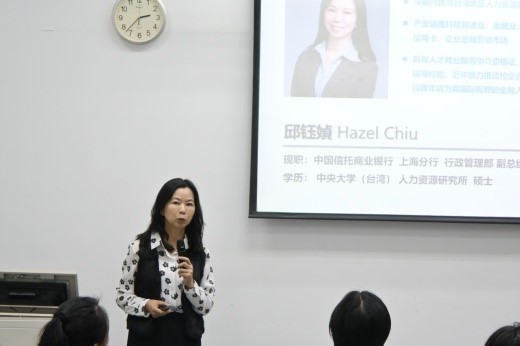 在主题分享环节,邱钰媜女士系统介绍了中国信托商业银行的综合实力,包括稳健的财务表现、卓越的信用评级、广泛的全球网络布局,以及其连续八年荣获“亚洲最佳企业雇主”的人才管理理念。她结合实例,生动阐释了“We are family”的品牌精神,强调了机构对青年人才培养的重视,并通过介绍多元晋升通道与灵活发展路径,展现了其开放、先进的人才观。此外,她也简要说明了相关职位的需求与特质,帮助同学们更具体地规划未来方向。